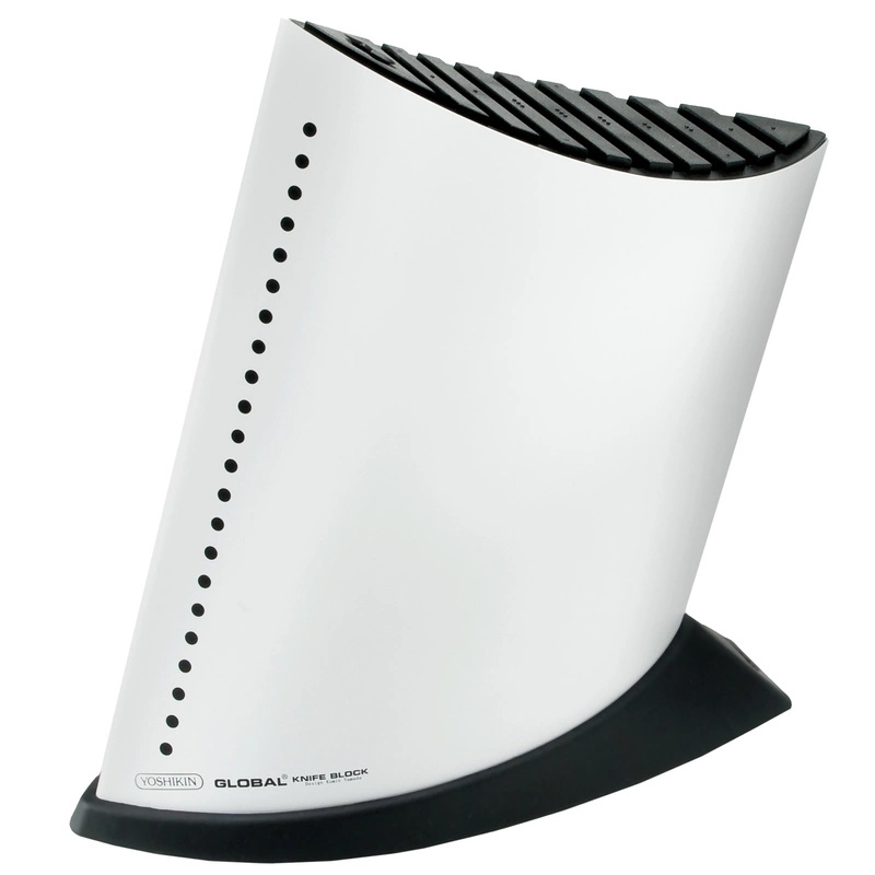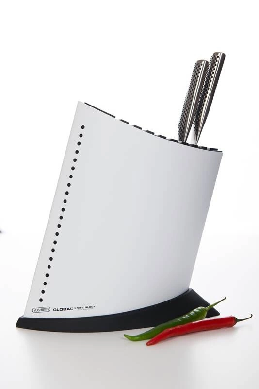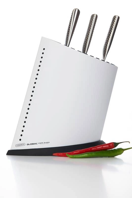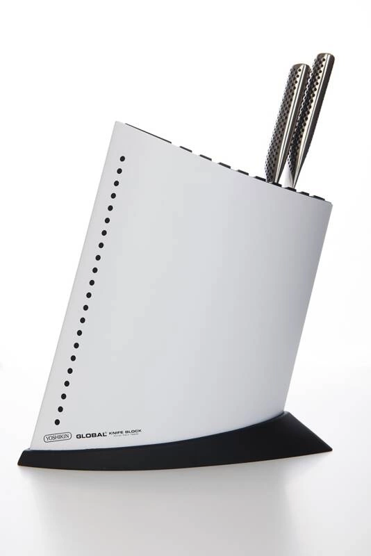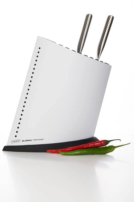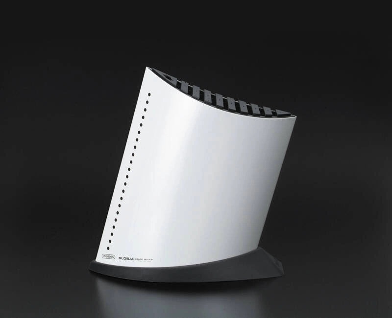 Pusty blok pomieści do dziewięć dowolnych noży Global o długości ostrza nie większej niż 24 cm. Dodatkowo ma jeszcze miejsce na stalkę lub nożyczki. Wyposażony w zdejmowaną antypoślizgową podstawę co ułatwia czyszczenie.