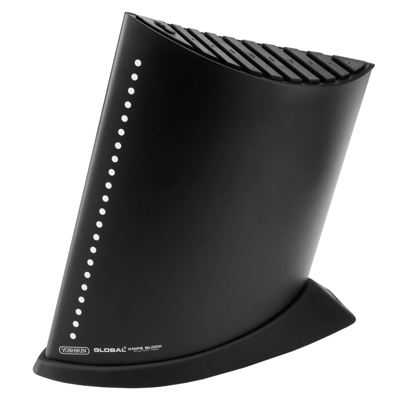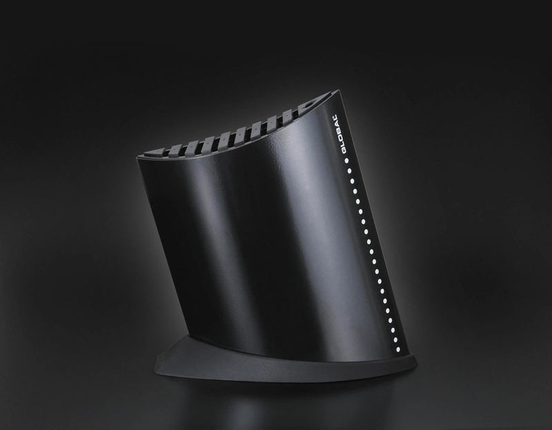 Pusty blok pomieści do dziewięci dowolnych noży Global o długości ostrza nie więszkej niż 24 cm. Dodatkowo ma jeszcze miejsce na stalkę lub nożyczki. Wyposażony w zdejmowaną antypoślizgową podstawę co ułatwia czyszczenie.