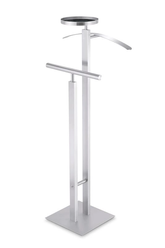 Stojak na ubrania wykonany w całości ze stali nierdzewnej. W górnej części umieszczona została praktyczna półka na drobiazgi.