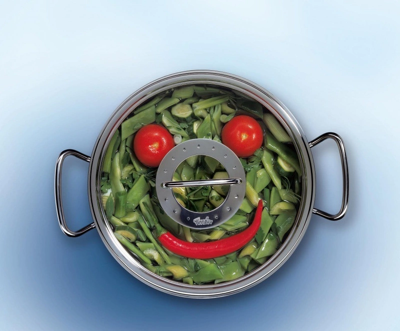 Wyjątkowo zaprojektowane szklane pokrywki garków z wgłębieniem w centralnej części umożliwiają cyrkulacje pary podczas gotowania. Taki proces nawilża potrawy oraz umożliwia gotowanie z małą ilością wody.