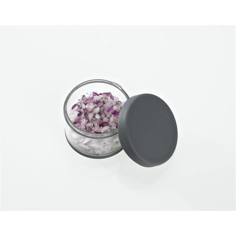 Dolną część siekacza można zdjąć i dzięki dodatkowej pokrywce wykorzystać jako mały pojemnik na świeżo posiekane przelnodukt.