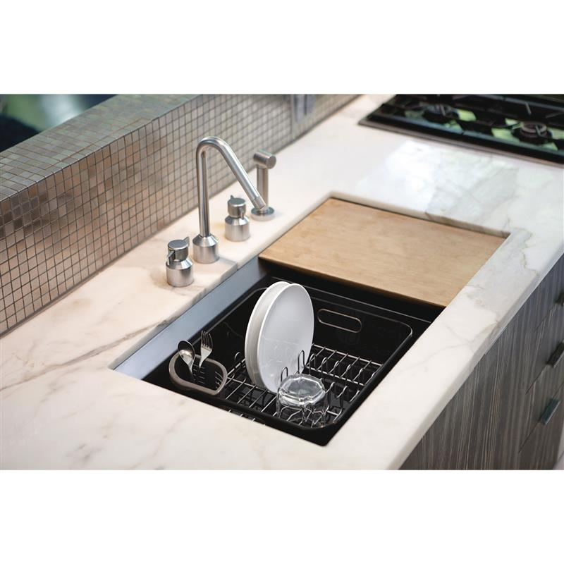 Ociekacz może stać bezpośrednio w zlewozmywaku jak i na blacie. Posiada obrotowy odpływ, który umożliwia ściekanie wody bezpośrednio do zlewu. Wyjmowany stalowy wkład i pojemnik na sztućce ułatwia czyszczenie plastikowej obudowy.