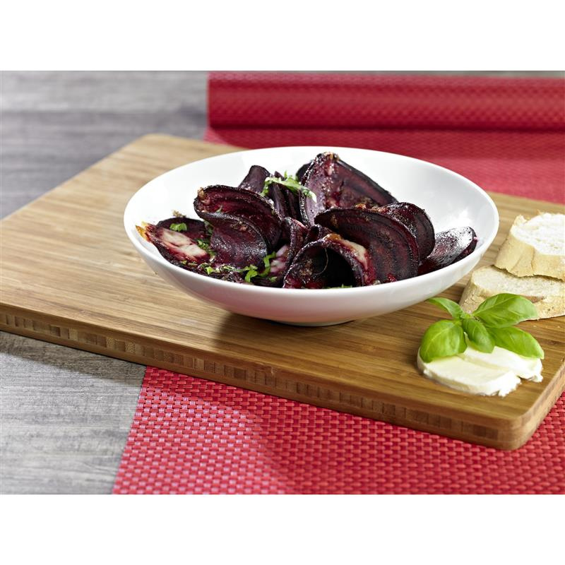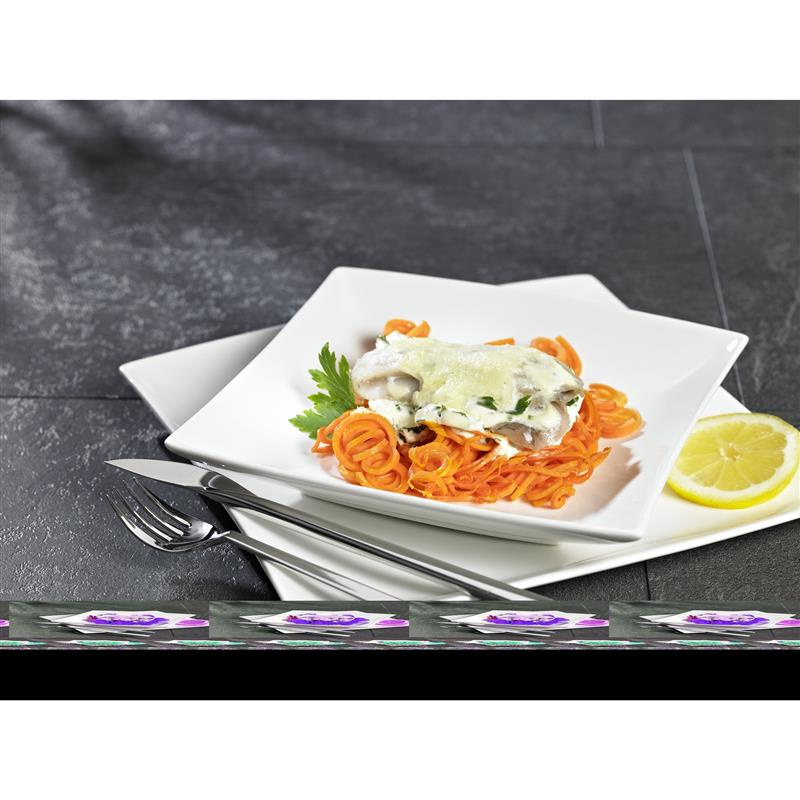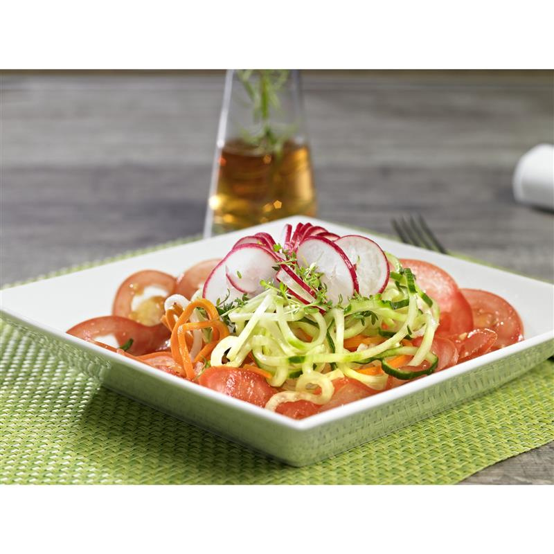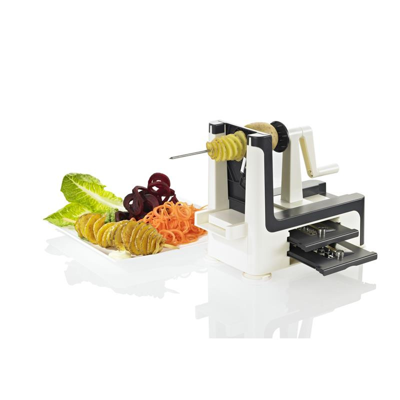 Tarka spiralna w prosty sposób kroi owoce i warzywa w długie paski „spaghetti” lub spiralę. Tarka ma trzy wymienne wkłady z ostrzami ze stali nierdzewnej, które można schować w podstawie urządzenia. Duże przyssawki zapewniają tarce stabilność i zapobiegają ślizganiu się po blacie.