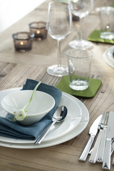 Prosty i funkcjonalny wzór sprawia, że jedzenie jest na pierwszym planie. Biel na stole to ponadczasowa elegancja.