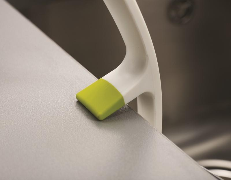 Ogromną zaletą tej szczotki jest specjalnie wyprofilowany gumowy uchwyt, który pozwala zawiesić szczotkę w zlewie. Woda i płyn spływają bezpośrednio do zlewu, co pozwala na zachowanie higieny jak i szybko osuszyć szczotkę.