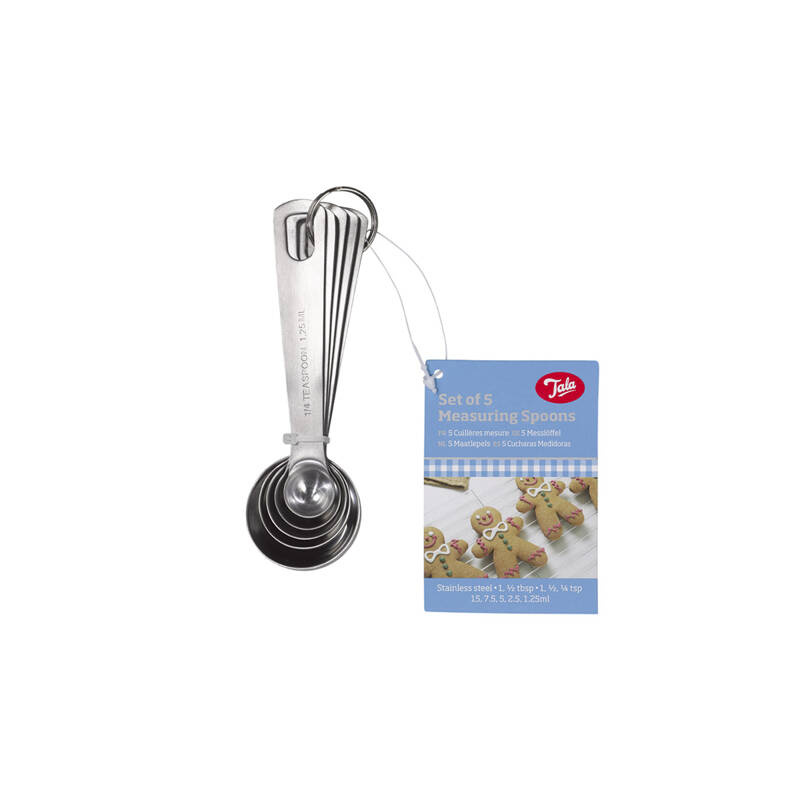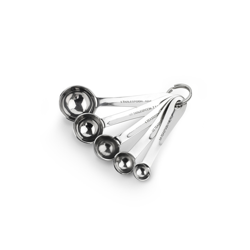 Zestaw 5 miarek-łyżewczek wykonanych ze stali nierdzewnej zawieszonym na rozpinanym kółku.