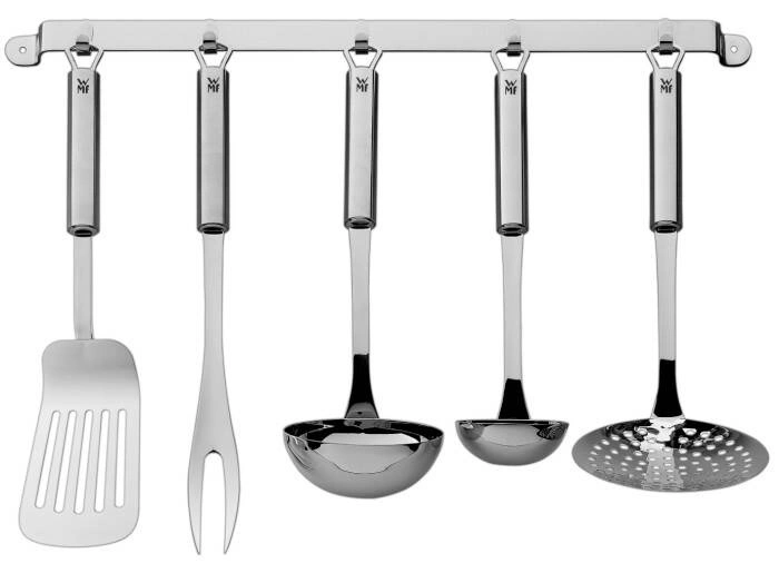 CECHY: - komplet narzędzi kuchennych: chochelka, łyżka cedzakowa, łyżka do sosu, łopatka, widelec do mięsa, - w komplecie wieszak (dł. 45 cm), - wykonane ze stali nierdzewnej Cromargan, - można myć w zmywarce. Wymiary: różne Kolor: srebrny Materiał: stal nierdzewna Cromargan Kolekcja: Profi Plus