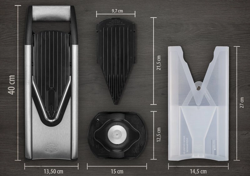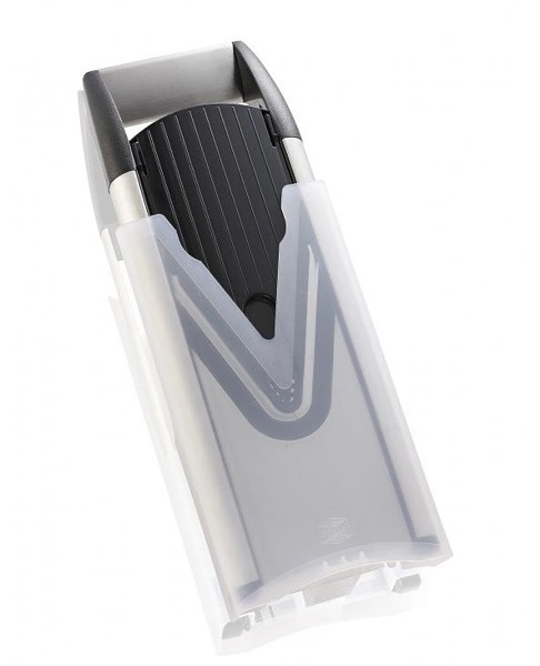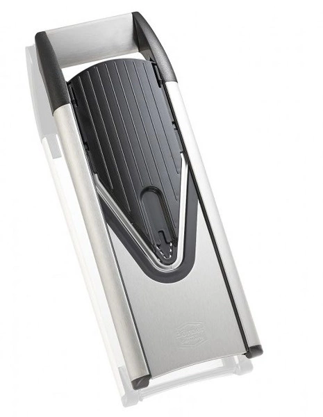 Mandolina V6 różni się od V5 przede wszystkim stalowym korpusem z którego została wykonana. Dzięki temu szatkownica zyskała większą stabilność i sztywność co docenią na pewno profesjonalni kucharze. Nie posiada jednak 4 stopniowej regulacji grubości szatkowania która jest w szatkownicach V5.