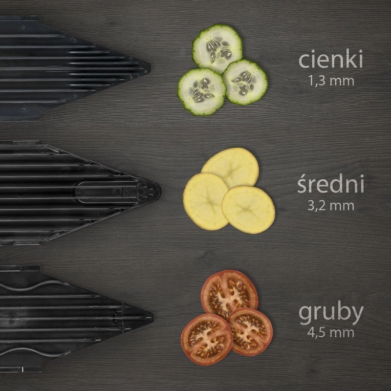 1. Wkładka "0" bez noży - zabezpieczająca, do przechowywania tarki oraz 0,7 mm (po obróceniu) - do szatkowania na plastry o grubości 0,7 mm