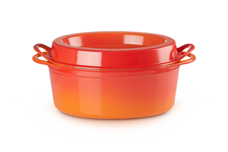 Klasyczny garnek Le Creuset znany był już w 1934 roku. Francuskie słowo „doufeu” oznacza „delikatny ogień” – garnek został tak nazwany, ponieważ nadaje się do gotowania na wolnym ogniu. Żeliwna konstrukcja zapewnia równomierne rozprowadzanie ciepła. Zatrzymuje też wilgoć, by dania były soczyste i idealnie ugotowane. Małe kropelki pary wodnej osiadają wewnątrz pokrywki i spływają z powrotem do dania. Aby uzyskać ten efekt, umieść kostki lodu na środku wgłębienia pokrywki.