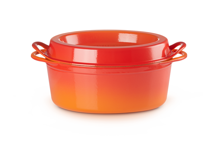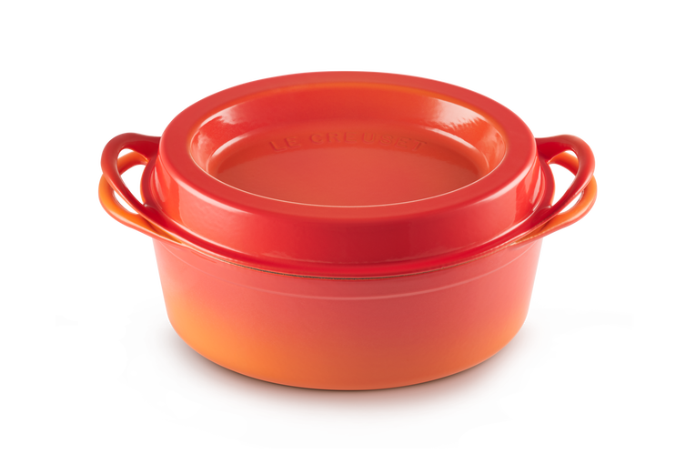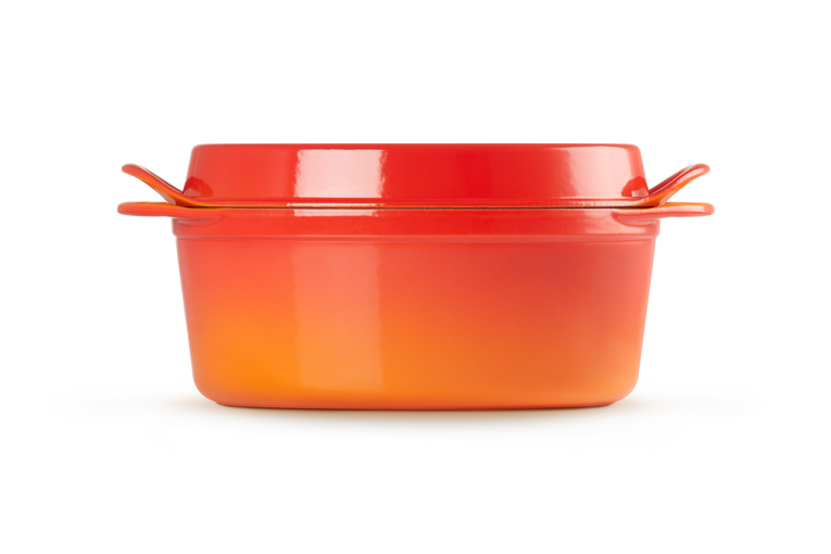 Klasyczny garnek Le Creuset znany był już w 1934 roku. Francuskie słowo „doufeu” oznacza „delikatny ogień” – garnek został tak nazwany, ponieważ nadaje się do gotowania na wolnym ogniu. Żeliwna konstrukcja zapewnia równomierne rozprowadzanie ciepła. Zatrzymuje też wilgoć, by dania były soczyste i idealnie ugotowane. Małe kropelki pary wodnej osiadają wewnątrz pokrywki i spływają z powrotem do dania. Aby uzyskać ten efekt, umieść kostki lodu na środku wgłębienia pokrywki.