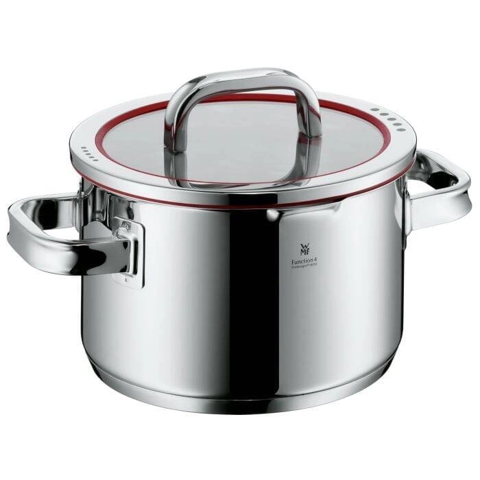 Pięcioczęściowy zestaw garnków Function 4 firmy WMF to wyjątkowa propozycja dla każdego miłośnika gotowania, który ceni wszechstronność i komfort w kuchni. Ten zestaw wyróżnia się efektownym czerwonym silikonowym pierścieniem w szklanej pokrywie, który nie tylko nadaje mu nowoczesny wygląd, ale przede wszystkim zapewnia wyjątkową funkcjonalność. Czerwone pierścienie w pokrywkach posiadają otwory sitowe o różnej wielkości, co ułatwia nalewanie płynów bez konieczności zdejmowania pokrywy. Niezależnie od tego, czy gotujesz makaron, czy drobnoziarnisty ryż, pokrywki można założyć w czterech oznaczonych pozycjach, co gwarantuje ich stabilność i bezpieczeństwo podczas gotowania.