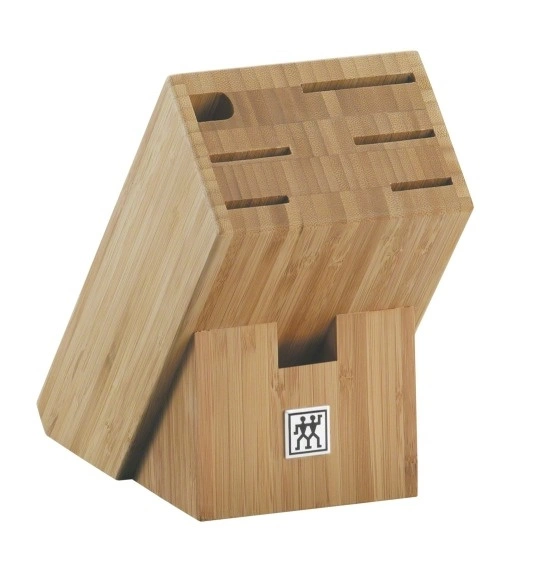 Zestaw noży w bloku niemieckiej marki Zwilling. Cztery najbardziej potrzebne noży do tego nożyczki, stalka i estetyczny bambusowy blok.