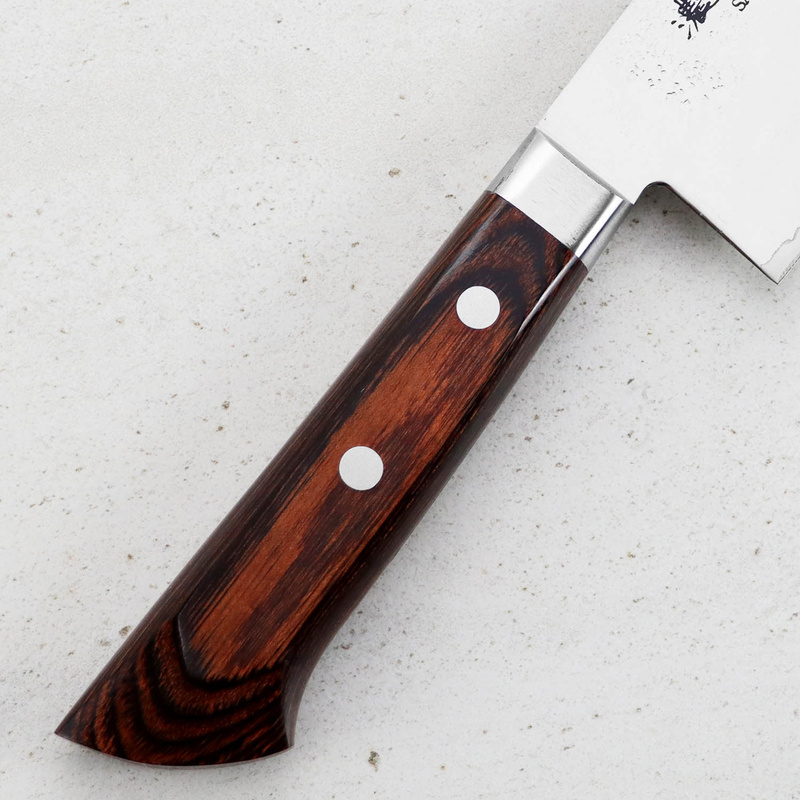 Noże Satake Unique Clad to doskonała propozycja dla kucharzy, którzy cenią sobie w pracy niezawodne narzędzia. Klingę wykonano z wysokiej jakości trójwarstwowej stali nierdzewnej molibdenowo-wanadowej AUS-8, która pozwala uzyskać niebywałą ostrość krawędzi tnącej przy stosunkowo łatwym procesie ostrzenia. Ergonomiczna rękojeść z wytrzymałego materiału Pakkawood jest odporna na wilgoć oraz wysokie temperatury. Noże z tej serii są wykończone z dbałością o każdy szczegół i niezwykle trwałe, a jednocześnie bardzo wygodne w utrzymaniu.