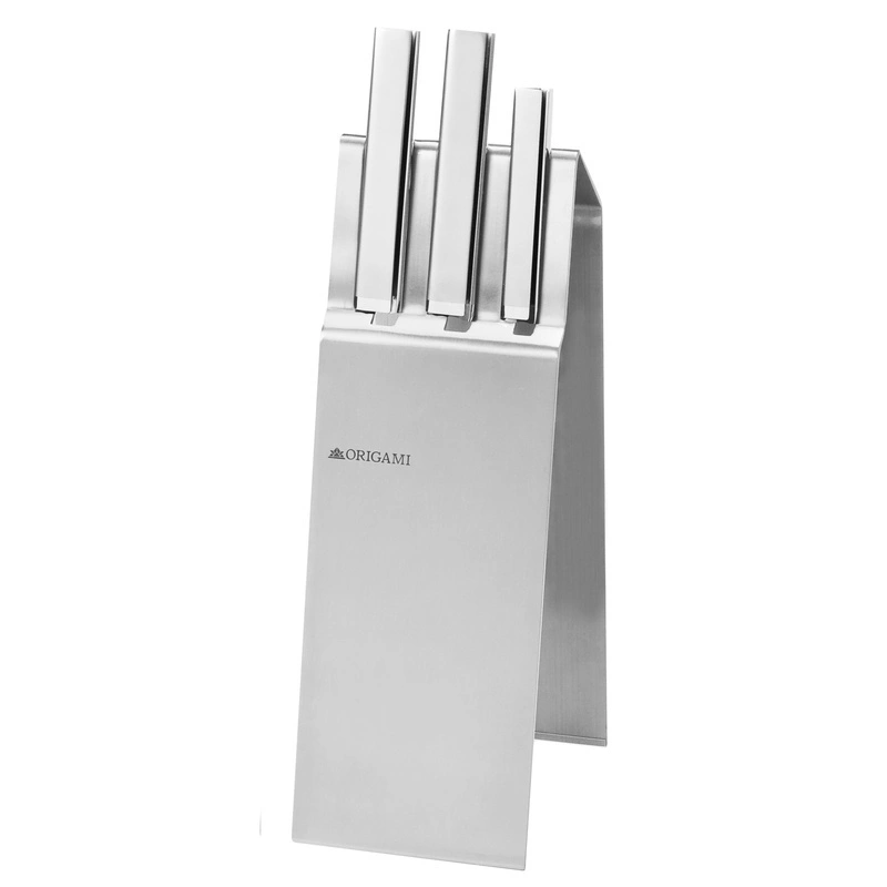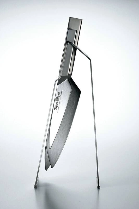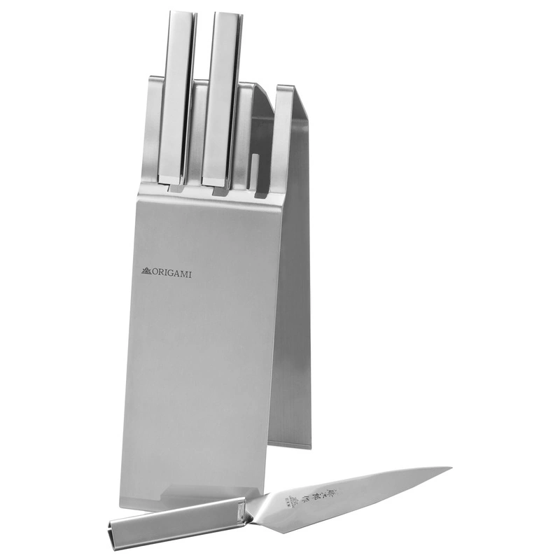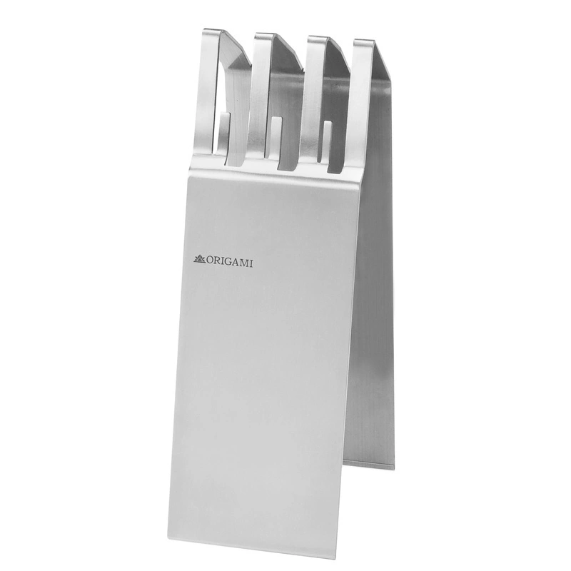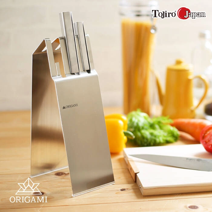 Oryginalny blok do noży, który pod względem wzornictwa stanowi dopełnienie serii Tojiro ORIGAMI. Blok powstał z pojedynczego arkusza stali i wyróżnia go prosta, wyważona elegancja. Stal pokryto przezroczystą powłoką, która chroni materiał przed zabrudzeniem i zapobiega powstawaniu plam oraz odbarwień. Podkładki z gumy silikonowej zabezpieczają delikatne powierzchnie przed zarysowaniem. Stylowa, minimalistyczna sylwetka idealnie pasuje do nowoczesnych wnętrz.