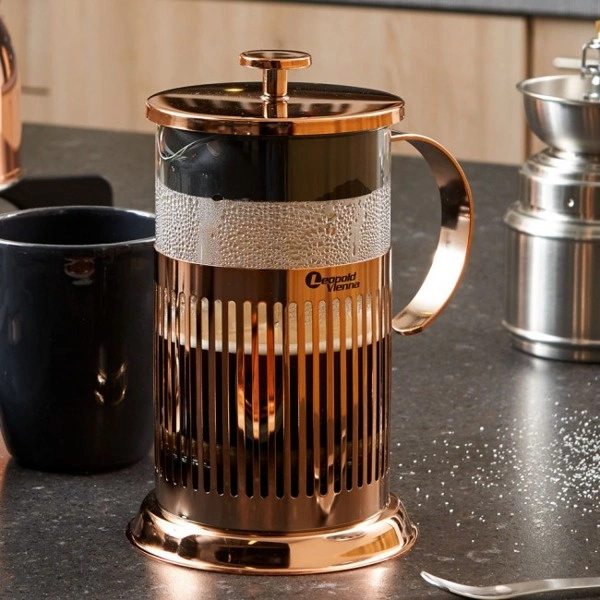 Stylowy zaparzacz do kawy typu French Press Leopold. Przykuwa uwagę dzięki ciekawemu projektowi i wysokiej jakości wykończenia. Ten miedziany dzbanek do kawy świetnie sprawdza się do parzenia aromatycznego naparu dla kilku osób.
