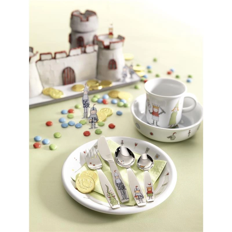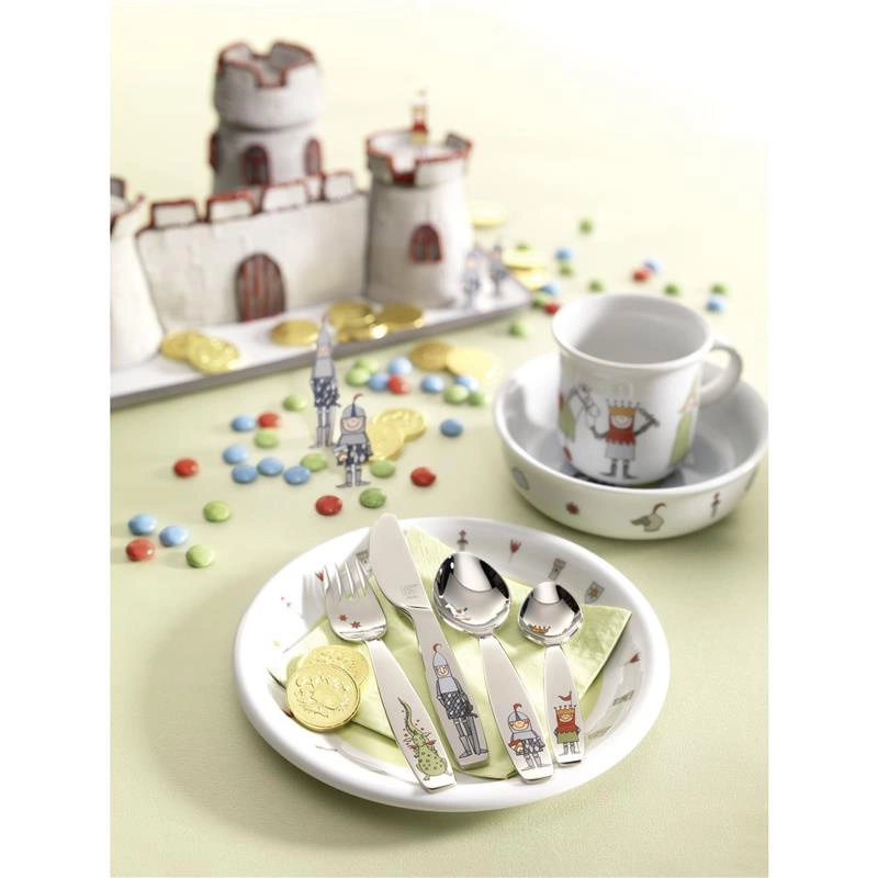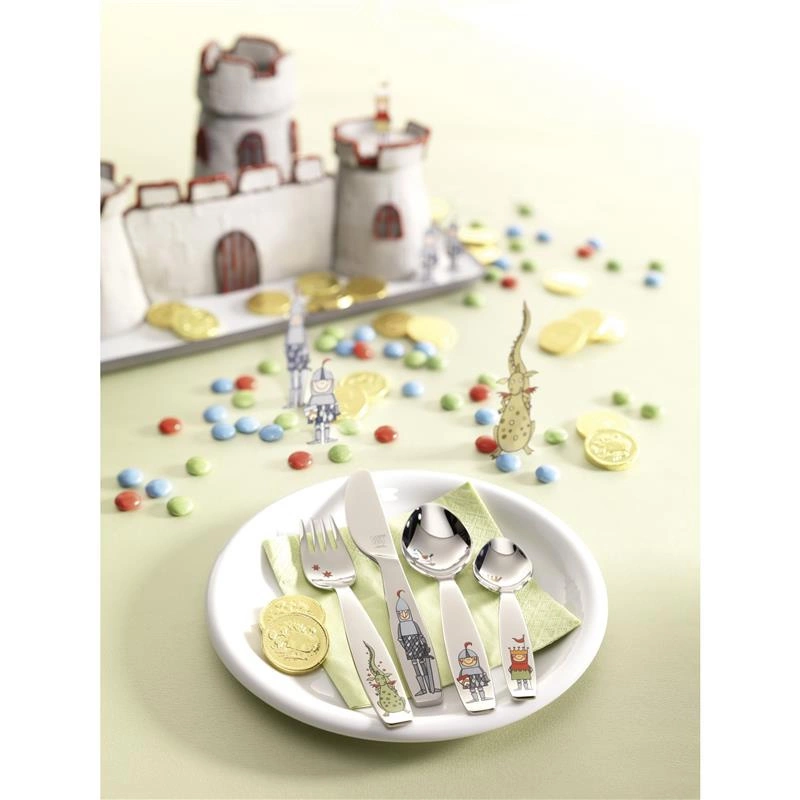 Sztućce ozdobione wizerunkami rycerza, giermka, księcia i smoka. Każdy z nich może zachęcić do zjedzenia kolejnego kęsa.