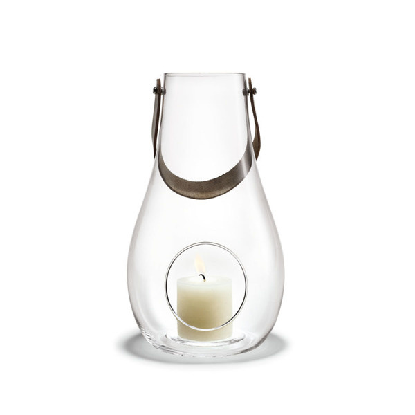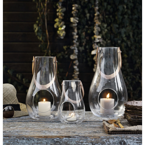 Duży lampion z serii Design with Light nawiązuję kształtem do prawdziwej latarni, jest wytwarzany ręcznie, a uroku dodaje mu skórzany uchwyt.