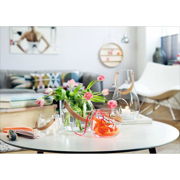 Pękaty wazon ze skórzanym uchwytem pięknie prezentuje kwiaty, jak i wiosenne bukiety. Ten szklany słój może zostać także wykorzystany jako stroik, gdy napełnimy go piaskiem, kamykami i innymi kolorowymi elementami, lub zastąpić paterę na owoce.