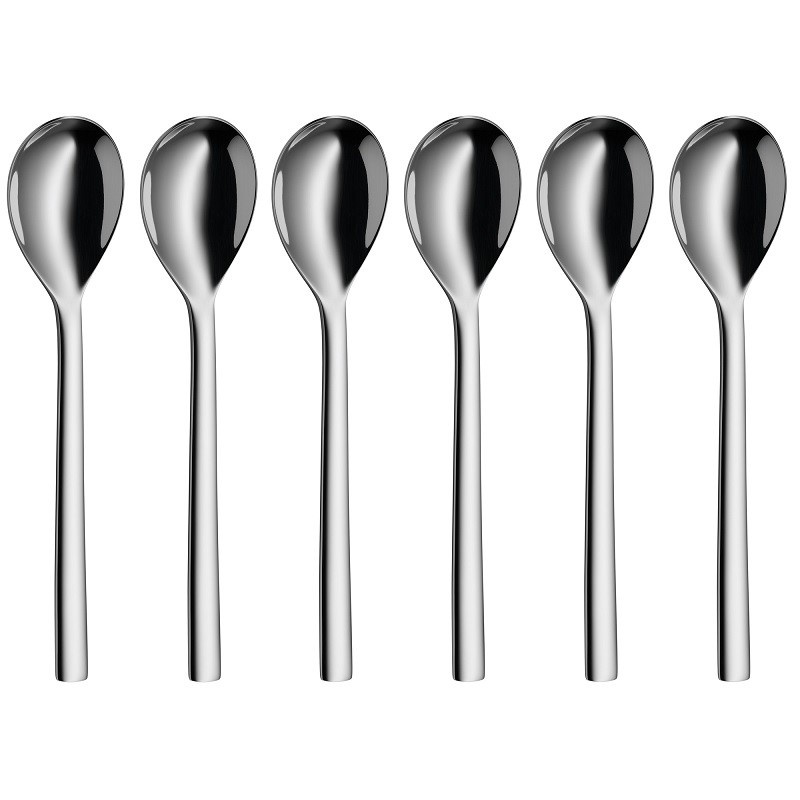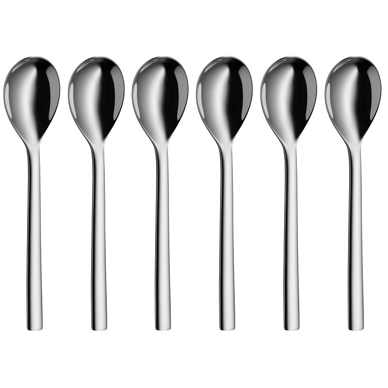 CECHY PRODUKTU: - zestaw 6 łyżeczek, - można myć w zmywarce. Wymiary: 15,5 cm Kolor: srebrny Materiał: polerowana stal nierdzewna Cromargan® Kolekcja: Nuova