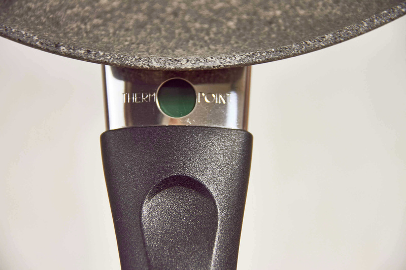 Seria Ferrara posiada uchwyt z tworzywa sztucznego wyposażony w Thermopoint - wskazujący idealną temperaturę smażenia. Gdy wskaźnik zmieni kolor na czerwony należy zmniejszyć źródło ciepła i tylko podtrzymywać właściwą do smażenia temperaturę.
