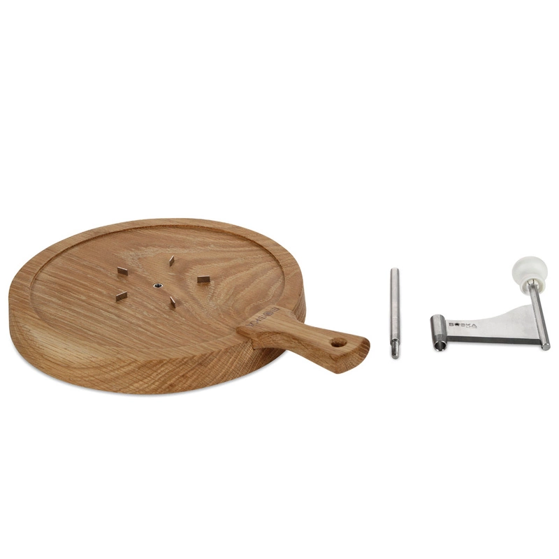 Przybliżone wymiary dębowej podstawy: szerokość deski z rączką 31 cm, , średnica deski bez rączki 23 cm, grubość 2,8 cm