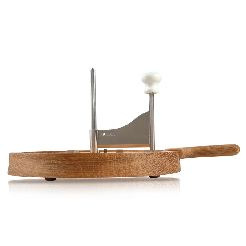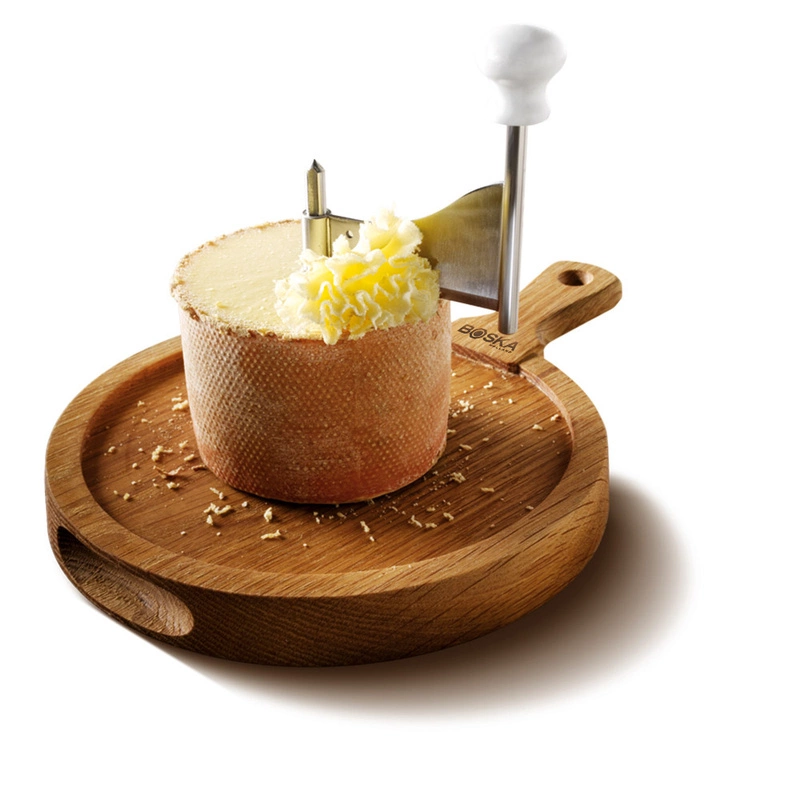 Strug Friends do Girolle i czekolady, dąb Wydobądź pełnię smaku z sera T?te-de-Moine zwijając go w fantazyjne girolle strugiem Friends! Dawniej do „strugania” sera T?te-de-Moine – Głowa Mnicha używano zwykłego noża, jednak z czasem wymyślono coś bardziej praktycznego i tak powstał strug do girolle, który gości prawie w każdym szwajcarskim domu! Strug Friends do Girolle z sera i czekolady to eleganckie, proste urządzenie składające się z masywnej, dębowej podstawy szerokiej na 2,8 cm z 5 metalowymi kolcami do nabicia sera, stalowego pręta mocującego i noża z białą rączką.