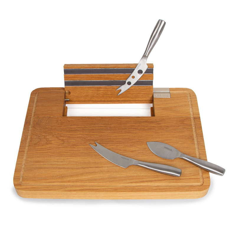 Dzięki temu noże będą bezpieczne i łatwo dostępne. W skład zestawu wchodzi: dębowa deska do serwowania z magnetyczną listwą i schowkiem na noże, 3 małe noże: nóż do serów twardych, o krótkiej, ostrej klindze, nóż do serów miękkich cheesy o rozwidlonym czubku i klindze przypominającej ser z dziarami oraz nóż do serów miękkich o rozwidlonym czubku. Przed pierwszym użyciem deskę należy solidnie naoliwić, pozwolić by drewno chłonęło olej przez kilka dni.