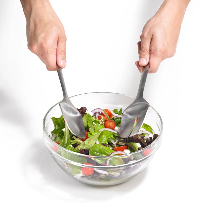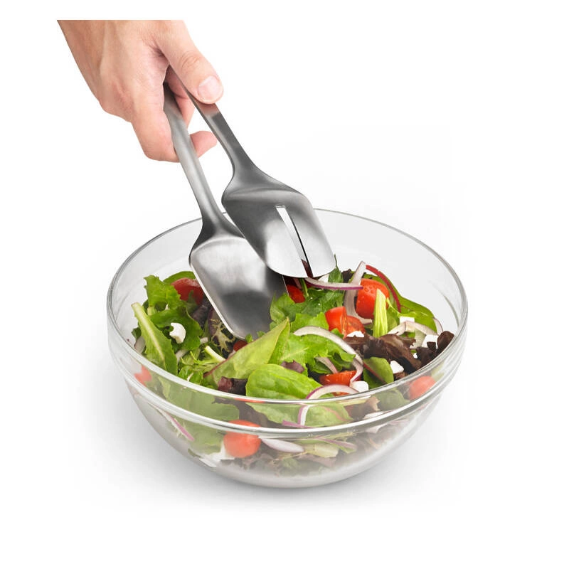 Uniwersalne i eleganckie szczypce do sałatek – widelec i łyżka - użyj razem lub osobno Szczegóły - 2 częściowy zestaw - widelec i łyżka - do użycia oddzielnie jako łyżka i widelec lub po połączeniu - jak szczypce - zaokrąglone krawędzie ułatwiają serwowanie sałatek - wykonane ze stali nierdzewnej,silikon - można myć w zmywarce Waga brutto: 239g Wymiary brutto: 31cm x8cmx3cm