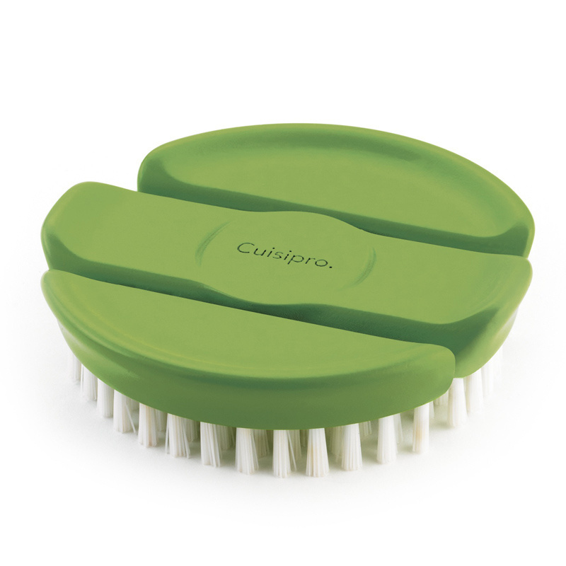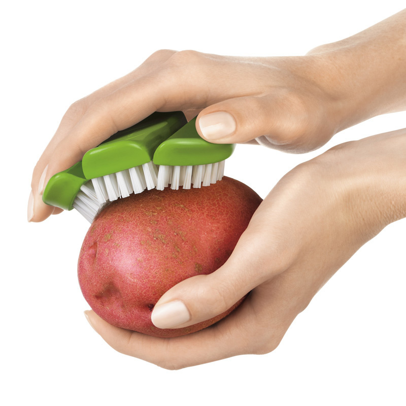 Oczyść warzywa dokładnie i wygodnie. • Szczoteczka posiada trzyczęściową konstrukcję, dzięki czemu delikatnie wygina się w dłoni dla lepszego i wygodniejszego chwytania. • Elastyczna szczoteczka zgina się dopasowując się do różnych kształtów i rozmiarów warzyw, aby lepiej je wyczyścić. • Sztywne włosie czyści dokładnie. • Ergonomiczny uchwyt jest dostępny w atrakcyjnym zielonym kolorze. • Można go myć w zmywarce na górnej półce