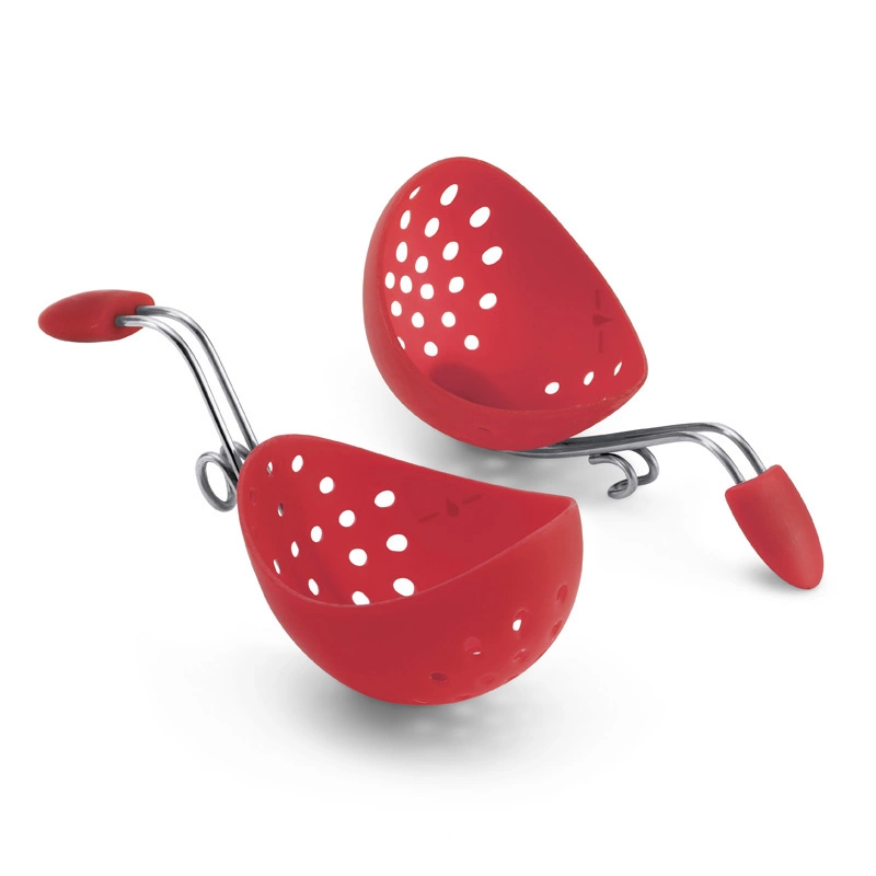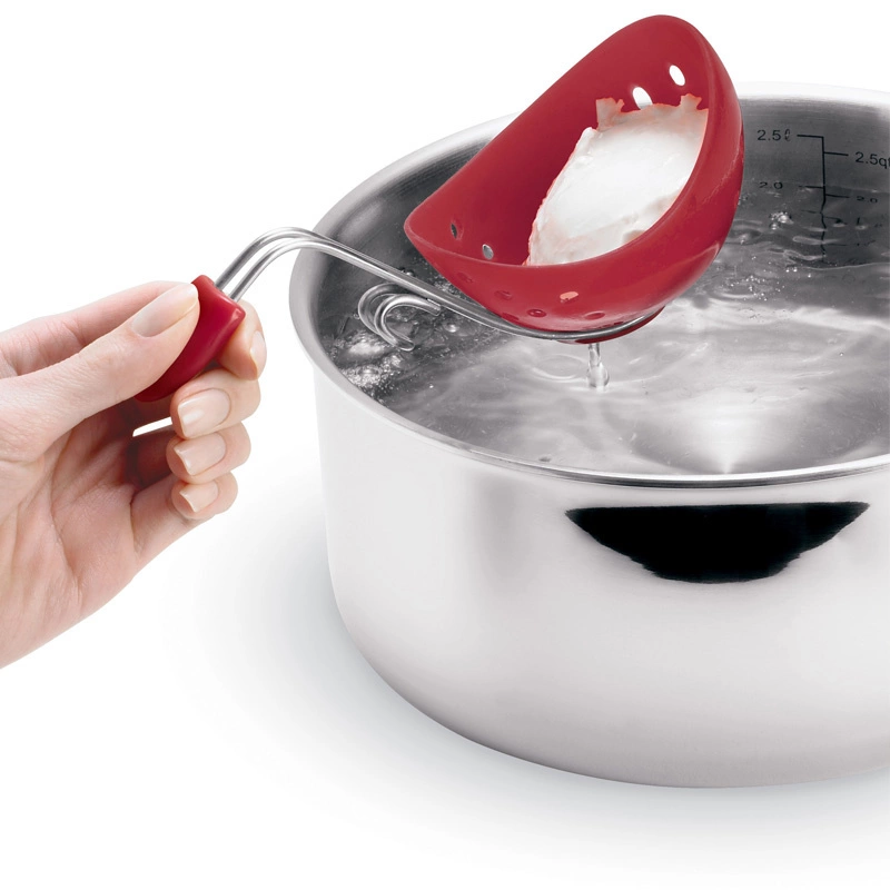 Zrób doskonale ugotowane i uformowane jajka w koszulkach przy użyciu niezawodnej foremki Cuisipro: • Poprzez otwory w dnie foremki woda delikatnie krąży wokół jajka. • Uchwyt w postaci haka zapewnia bezpieczne zamocowanie foremki na krawędzi garnka. • Przed wyjęciem jajka odchyl foremkę do tyłu, aby nadmiar wody został odsączony przez otworki w tylnej ściance. • Zestaw zawiera 2 czerwone foremki. • Wykonane z nieprzywieralnego silikonu, który łatwo można opłukać a także myć w zmywarce na górnej półce.