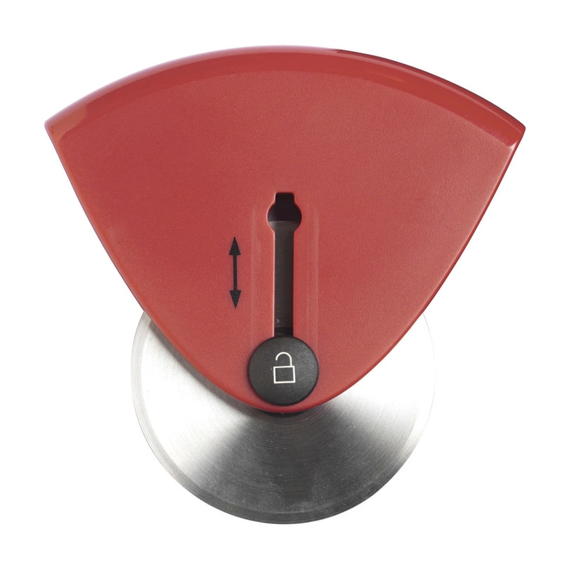 Sprawia to, że nóż nie tylko łatwo kroi pizzę, ale też jest bezpieczny w używaniu. Obudowa noża idealnie dopasowuje się do dłoni, trzymane w ten sposób ostrze łatwiej kroi pod wpływem ciężaru ręki. Na obudowie znajduje się specjalny przycisk, którego przesunięcie w górę lub w dół, wysuwa albo chowa ostrze blokując je w wybranej pozycji.