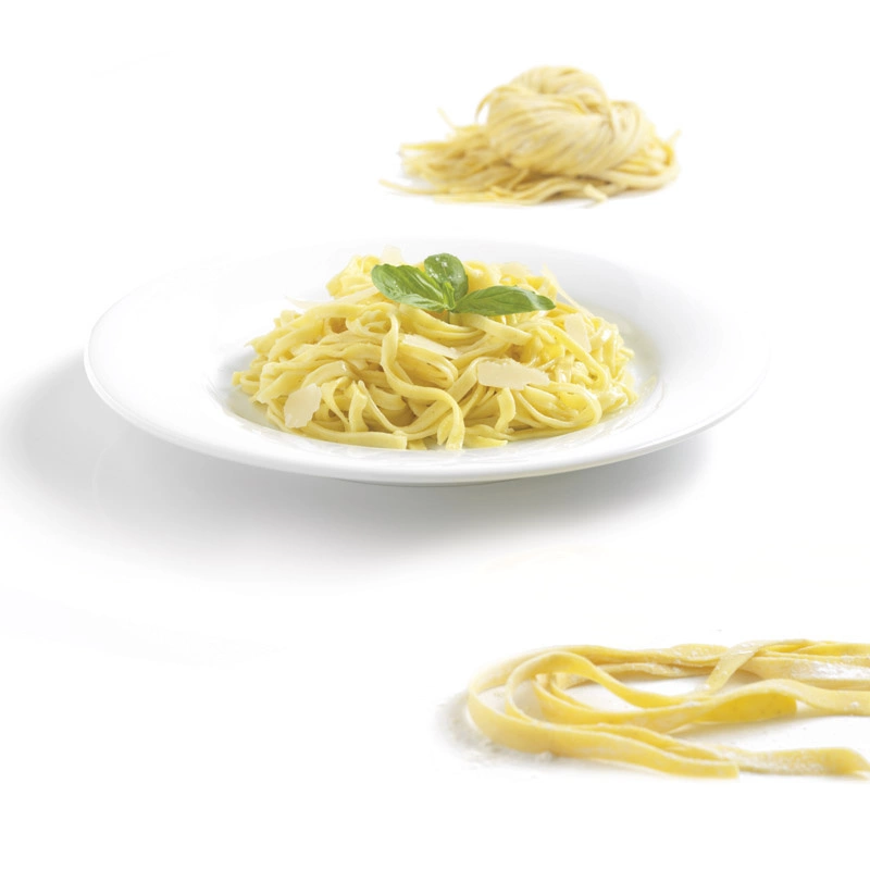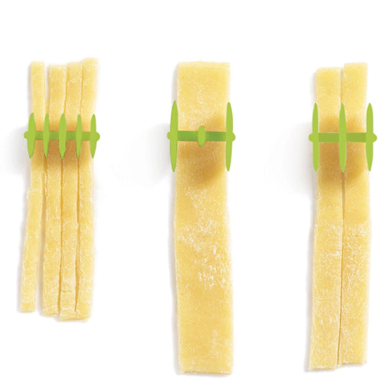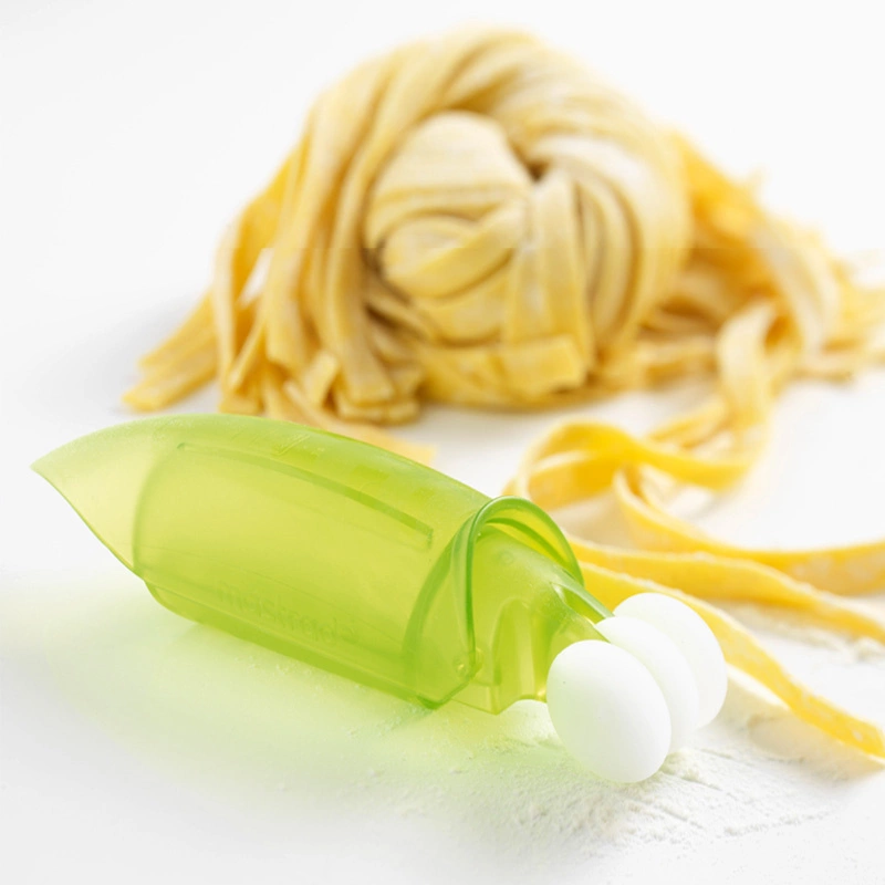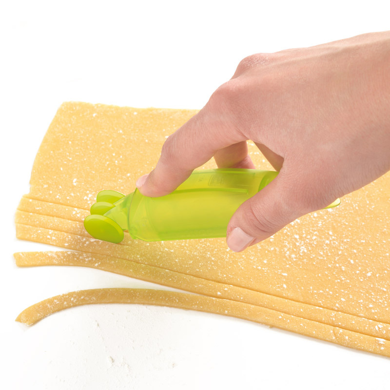 Niewielkie ale bardzo poręczne urządzenie do cięcia domowego makaronu na 3 różne grubości. Krajalnica w zestawie ma 3 wymienne kółka, które pozwalają pokroić makaron na różną szerokość: linguine - wąskie wstążki (4 mm), fettuccine - wstążki średniej szerokości (7 mm), tagliatelle - bardzo szerokie wstążki (16 mm). Rączka krajalnicy ma ergonomiczny kształt, który sprawia, że dobrze leży w dłoni i praca nią jest bardzo łatwa. Kółeczka można przechowywać w rączce, dzięki temu nie zgubią się w kuchennej szufladzie.