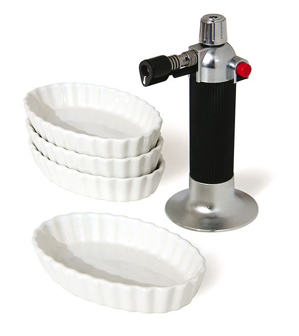 W skład zestawu wchodzi: palnik z regulacją płomienia , 4 owalne ceramiczne formy oraz broszura z przepisami – brak w języku polskim.