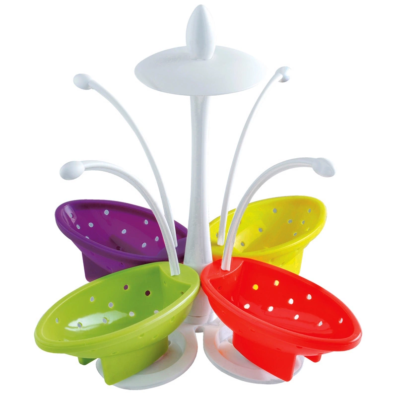 Mastrad - ZESTAW DO JAJEK W KOSZULKACH (4 SZTUKI)kolorowy( foremki zielone, czerwone, żółte, fioletowe, biały stojak i uchwyty)