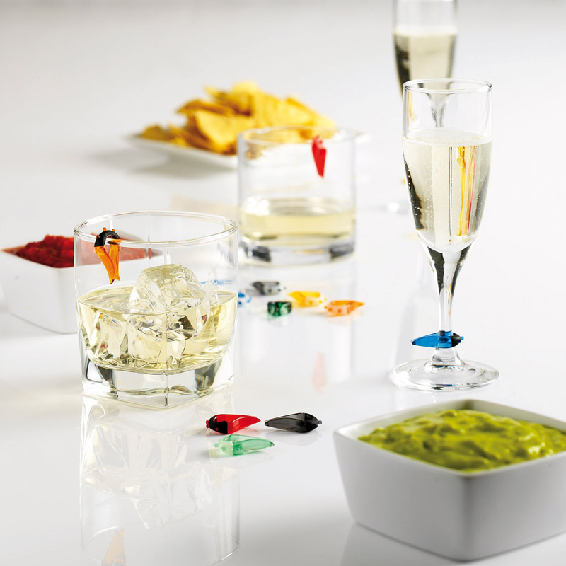 Znaczniki w formie spinaczy, można je przypiąć na brzegu szklanki lub kieliszka. Sprawią, że nikt nie zgubi swojego drinka. Każdy jest w innym kolorze.