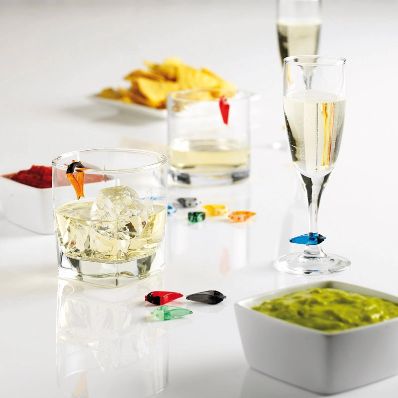 Znaczniki w formie spinaczy, można je przypiąć na brzegu szklanki lub kieliszka.