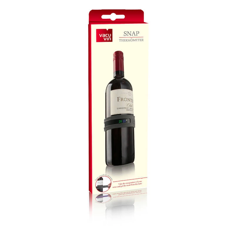 Na odwrocie opaski znajdują się prawidłowe temperatury w jakich należy podawać poszczególne gatunki wina. Termometr jest zapakowany w ładne pudełko prezentowe. • Pozwala łatwo odczytać temperaturę wina (skala Celsjusza). • Elastyczna opaska dopasowuje się do każdej butelki. • Na odwrocie zawiera wykaz odpowiednich temperatur dla różnych win.