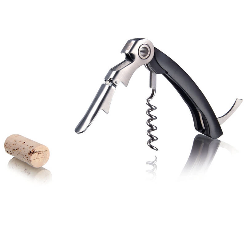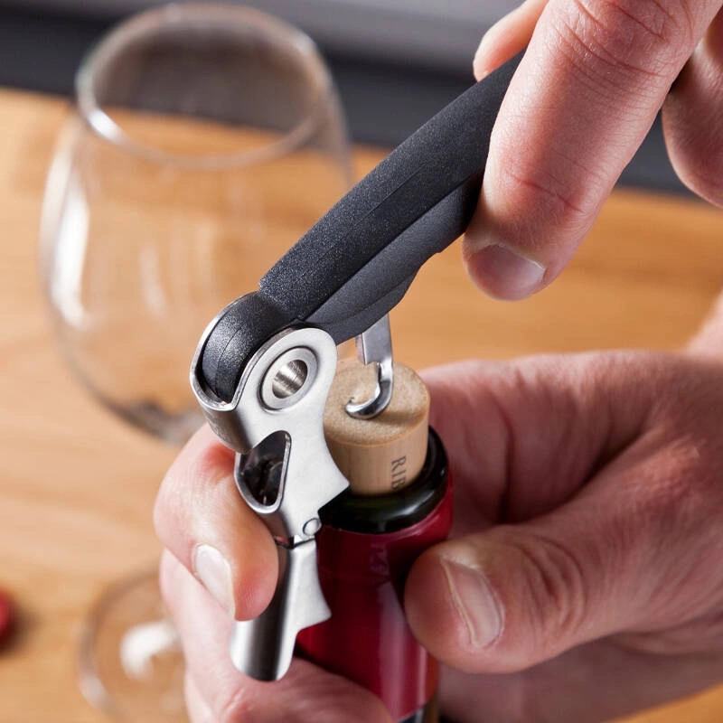 Jego działanie oparte jest na mechanizmie umieszczonym w zawiasie, co pozwala odkorkować butelkę szybko i bez wysiłku. Korkociąg jest lekki i nie zajmuje dużo miejsca.