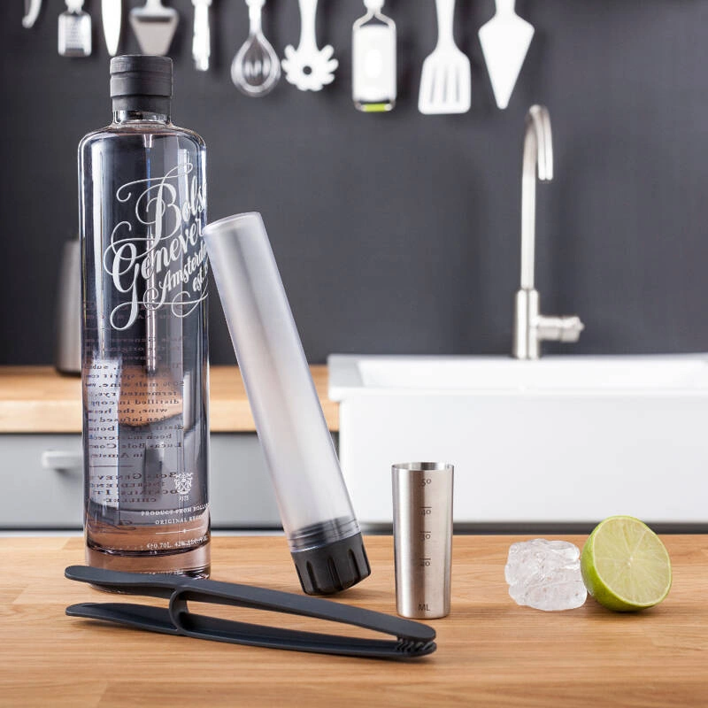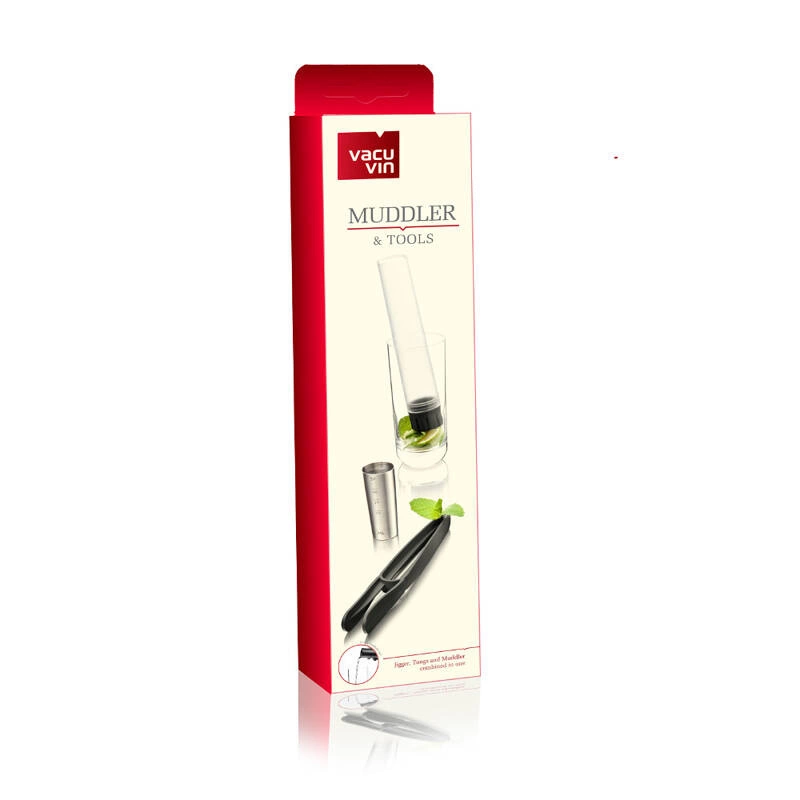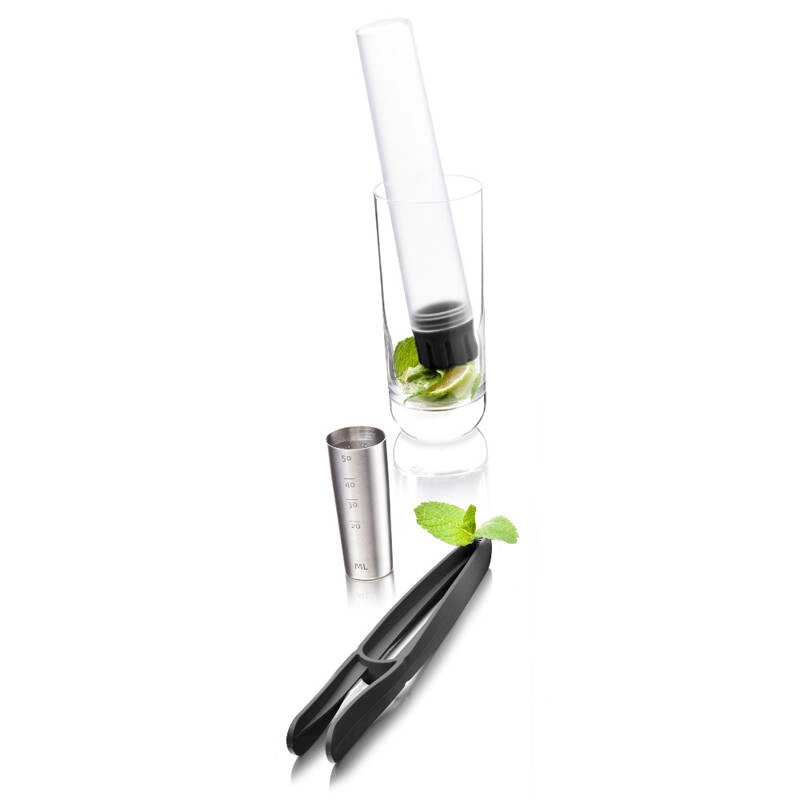 W skład zestawu wchodzą: szczypce, miarka, zgniatacz. Szczypce służą do nakładania kostek lodu i innych składników koktajli. Metalowa miarka z podziałką (20, 30, 40 i 50ml) do precyzyjnego odmierzania alkoholu. Zgniatacz - stanowią go przezroczysta tuba i nakrętka.