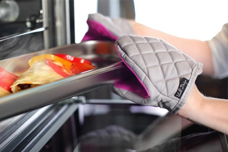 Poręczna, krótka rękawica kuchenna Livio marki Vialli Design, została stworzona z najlepszej jakości materiałów, 100%-owej bawełny, a wewnętrzna część rękawicy pokryta jest grubą warstwą silikonu, która jest odporna na temperatury do 260 stopni Celsjusza. Pikowana oryginalna rękawica to niezbędne akcesorium w każdej kuchni - szybko można ją zarówno włożyć na dłoń jak i zdjąć. Gwarantuje bezpieczeństwo termiczne i ochronę przed poparzeniem wnętrza i wierzchniej strony dłoni. Wersje kolorystyczne produktu idealnie wpasują się we wnętrze każdej kuchni i doskonale prezentują się wisząc przy kuchennych okapach, relingach, czy przy piecu.