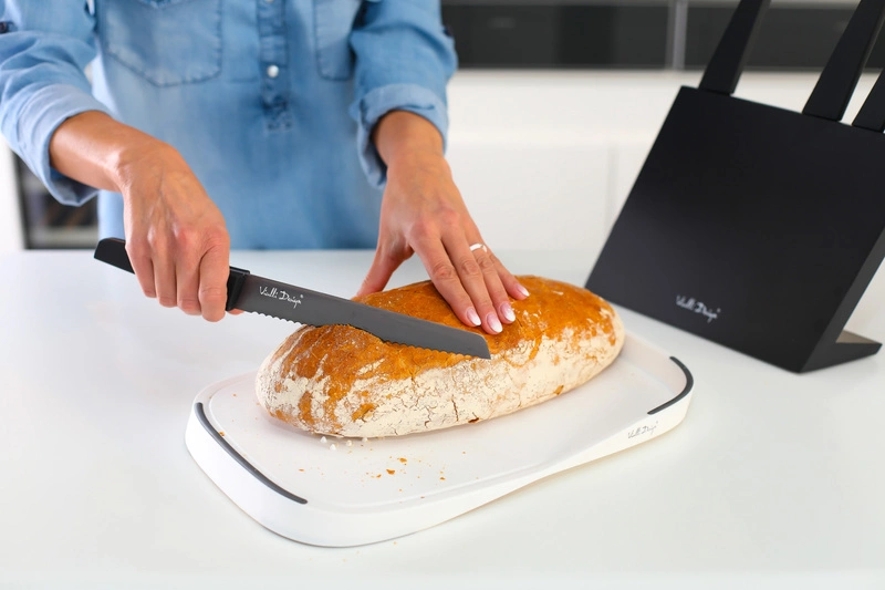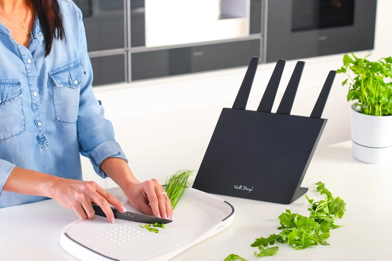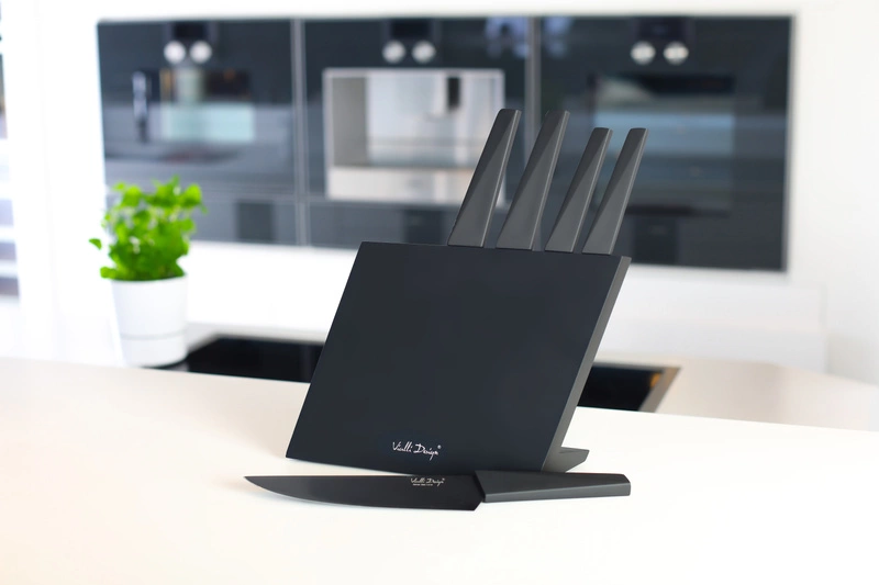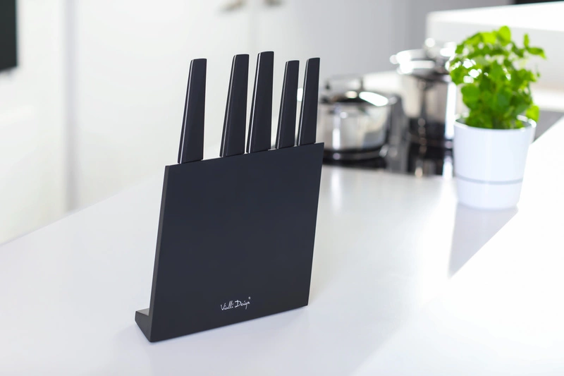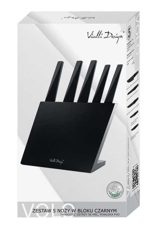 Nowoczesny i funkcjonalny zestaw 5 noży w drewnianym stojaku z serii VOLO marki Vialli Design w kolorze czarnym. Ostrza noży wykonane są z wysokiej jakości niemieckiej stali nierdzewnej HRC 56 pokryte nieprzywierającą powłoką PVD. Dzięki odpowiedniemu wyprofilowaniu, wygodnie leżą w dłoni i zapewniają komfort oraz bezpieczeństwo podczas pracy. Każdy z noży jest przeznaczony do konkretnych funkcji dlatego razem tworzą zestaw idealny do pracy w kuchni, a przyrządzenie potraw staje się jedynie czystą przyjemnością. Zestaw zawiera: blok do noży Nóż szefa kuchni - ostrze 20 cm Nóż do chleba - ostrze 20 cm Nóż do mięsa - ostrze 20 cm Nóż kuchenny uniwersalny - ostrze 12 cm Nóż do obierania - ostrze 9 cm