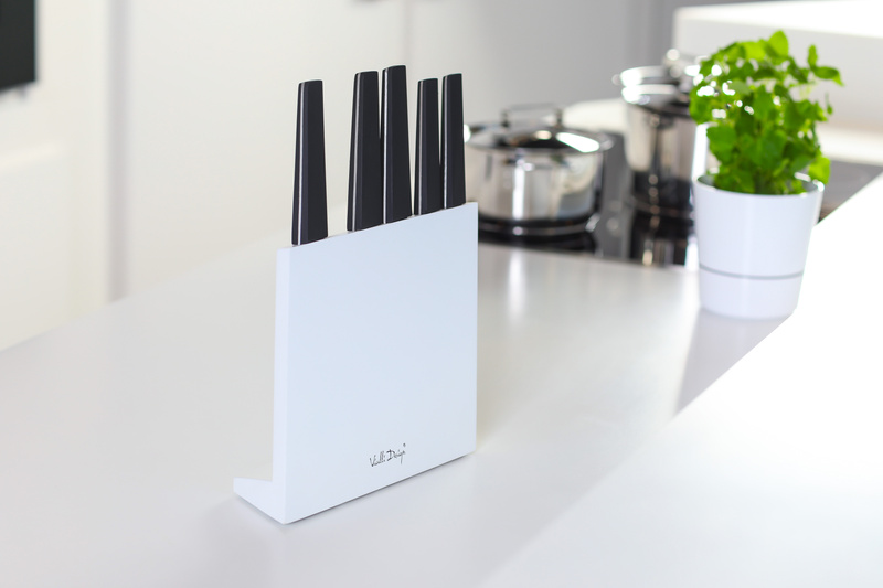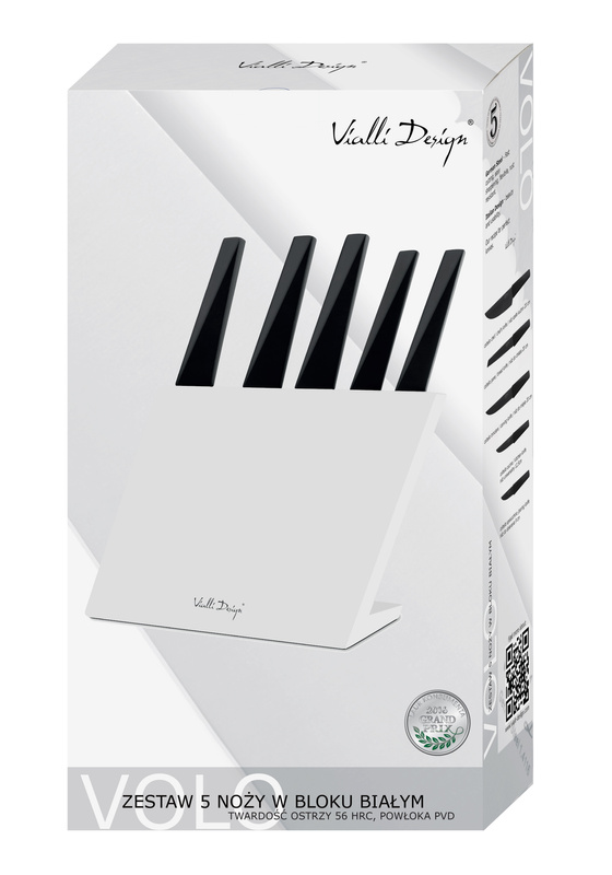 Nowoczesny i funkcjonalny zestaw 5 noży w drewnianym stojaku z serii VOLO marki Vialli Design w kolorze białym. Ostrza noży wykonane są z wysokiej jakości niemieckiej stali nierdzewnej HRC 56 pokryte nieprzywierającą powłoką PVD. Dzięki odpowiedniemu wyprofilowaniu, wygodnie leżą w dłoni i zapewniają komfort oraz bezpieczeństwo podczas pracy.