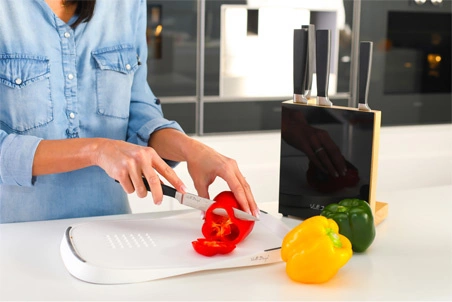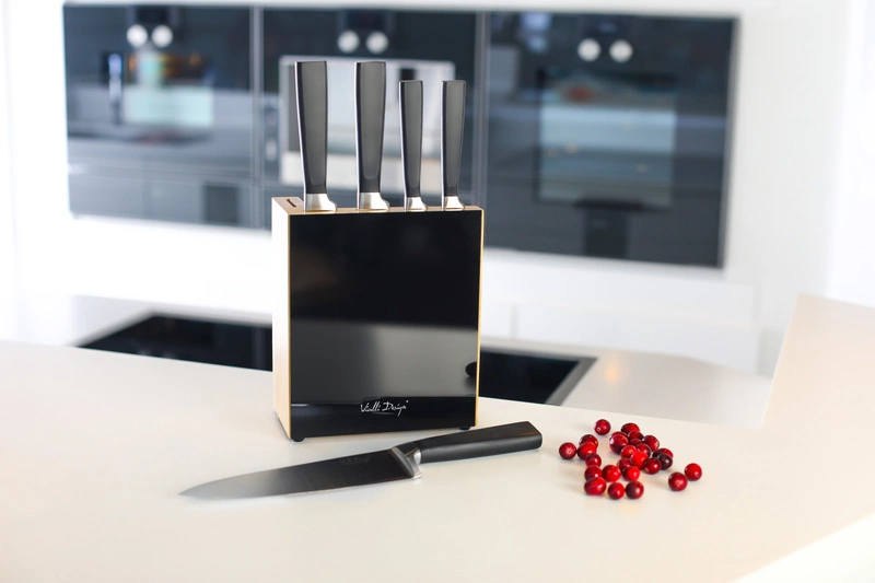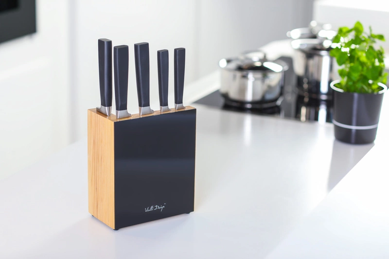 Nowoczesny i funkcjonalny zestaw 5 noży w drewnianym stojaku z serii FINO marki Vialli Design w kolorze czarnym. Zestaw składa się z 5 kutych noży, których ostrza wykonane są z wysokiej jakości niemieckiej stali nierdzewnej oraz ze stojaka z drewna jesionowego, którego przód pokryty jest czarnym akrylem. Dzięki odpowiedniemu wyprofilowaniu rękojeści, noże wygodnie leżą w dłoni i zapewniają komfort oraz bezpieczeństwo podczas pracy. Każdy z noży jest przeznaczony do konkretnych funkcji dlatego razem tworzą zestaw idealny do pracy w kuchni, a przyrządzenie potraw staje się jedynie czystą przyjemnością. Zestaw zawiera: blok do noży Nóż szefa kuchni - ostrze 20 cm Nóż do chleba - ostrze 20 cm Nóż do mięsa - ostrze 20 cm Nóż kuchenny uniwersalny - ostrze 12 cm Nóż do obierania - ostrze 9 cm