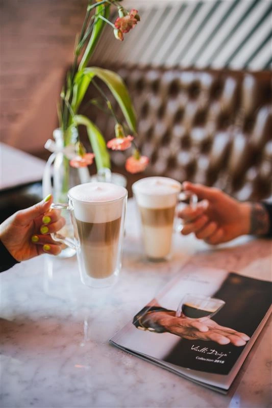 Wysoka i smukła forma szklanki Diva znakomicie podkreśli warstwy kawy latte, produkt ten bowiem łączy funkcję użytkową z wizualną.