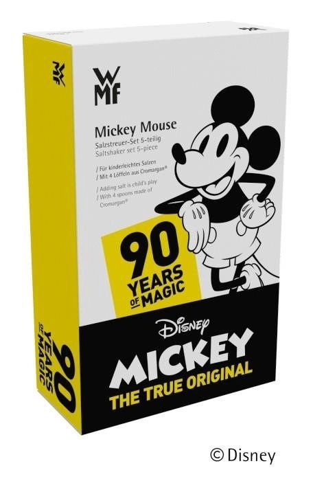 - w zestawie: solniczka w kształcie Myszki Miki i cztery stalowe łyżeczki z z uchwytami zakończonymi głową Myszki Miki,