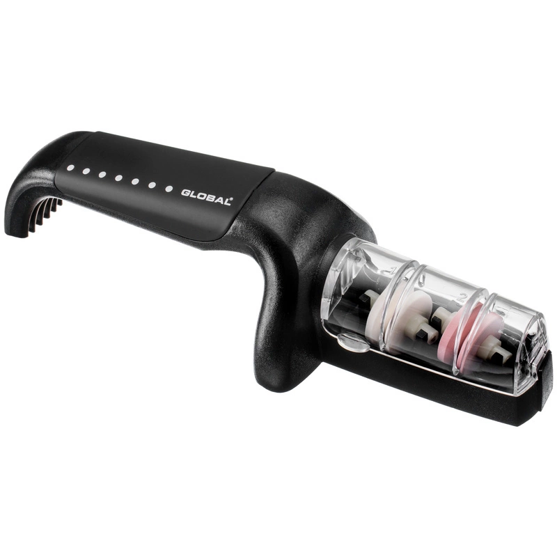 Dwufazowa ostrzałka ceramiczna, zaprojektowana specjalnie dla noży Global i przeznaczona do ostrzenia wszystkich rodzajów noży, z wyjątkiem tych o szlifach jednostronnych, np. tradycyjnych noży japońskich. Dzięki wodzie proces ostrzenia przebiega szybciej, a fabrycznie ustawione otwory ułatwiają naostrzenie noża pod odpowiednim kątem. Gumowany uchwyt i podstawa mają właściwości przeciwpoślizgowe.