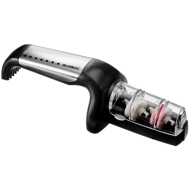 Dwufazowa ostrzałka ceramiczna, zaprojektowana specjalnie dla noży Global i przeznaczona do ostrzenia wszystkich rodzajów noży, z wyjątkiem tych o szlifach jednostronnych, np. tradycyjnych noży japońskich. Dzięki wodzie proces ostrzenia przebiega szybciej, a fabrycznie ustawione otwory ułatwiają naostrzenie noża pod odpowiednim kątem. Gumowany uchwyt i podstawa mają właściwości przeciwpoślizgowe.