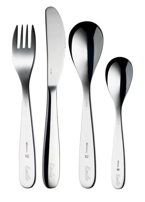 - zestaw sztućców dla dzieci powyżej 3 roku zycia, - wykonane z polerowanej stali nierdzewnej Cromargan, - na raczkach kolorowe nadruki, - zaokrąglone kształty, - można myć w zmywarce. Wymiary: dł. sztućców: 16,5 cm; 18,5 cm; 16,5 cm 13 cm; Materiał: polerowana stal nierdzewna Cromargan Kolor: srebrny
