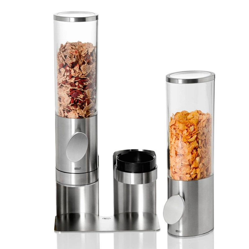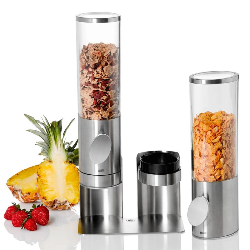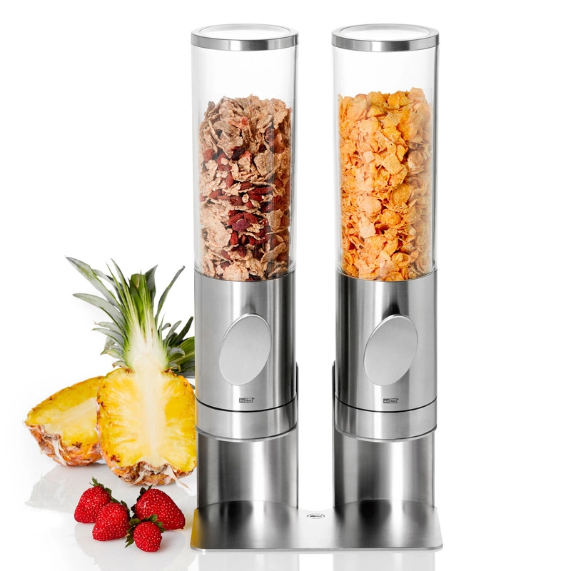 Podwójny dyspenser DEPOSITO DUO może być wykorzystywany do różnego rodzaju płatków kukurydzianych i musli, ryżu, pszenicy, cukierków, orzechów i innych sypkich produktów spożywczych.